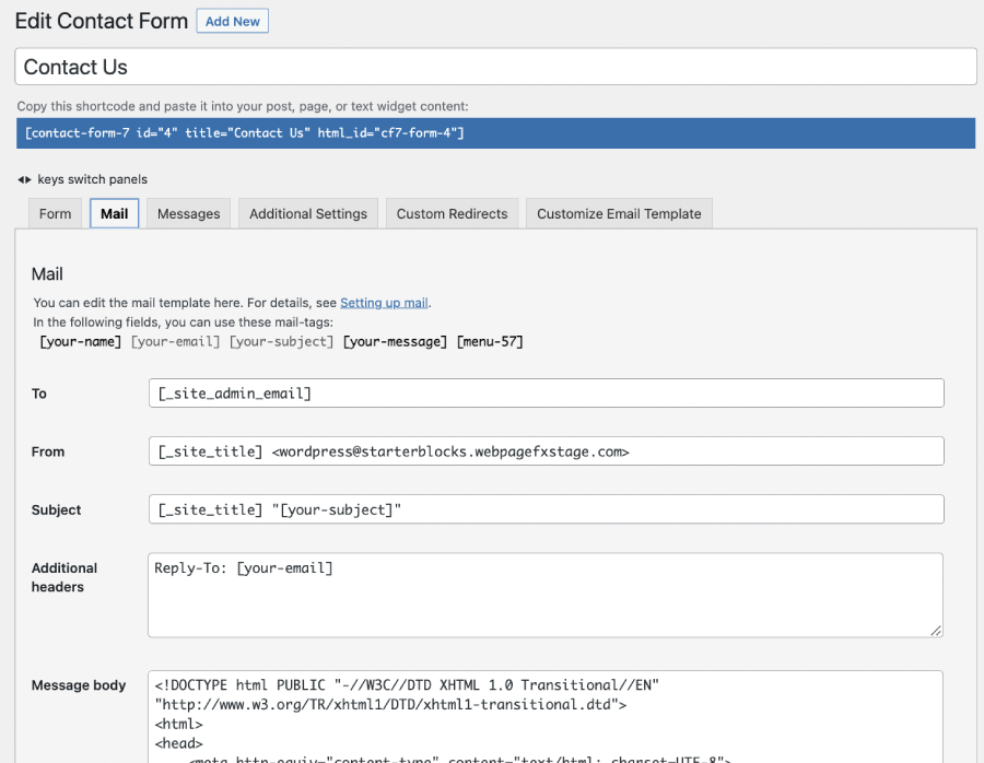 To change where form data is sent, click the “Mail” tab above the text editor. Within this tab, you will be able to edit where your contact form submissions are sent and how they are formatted.